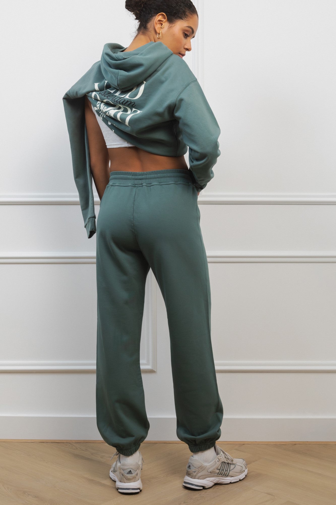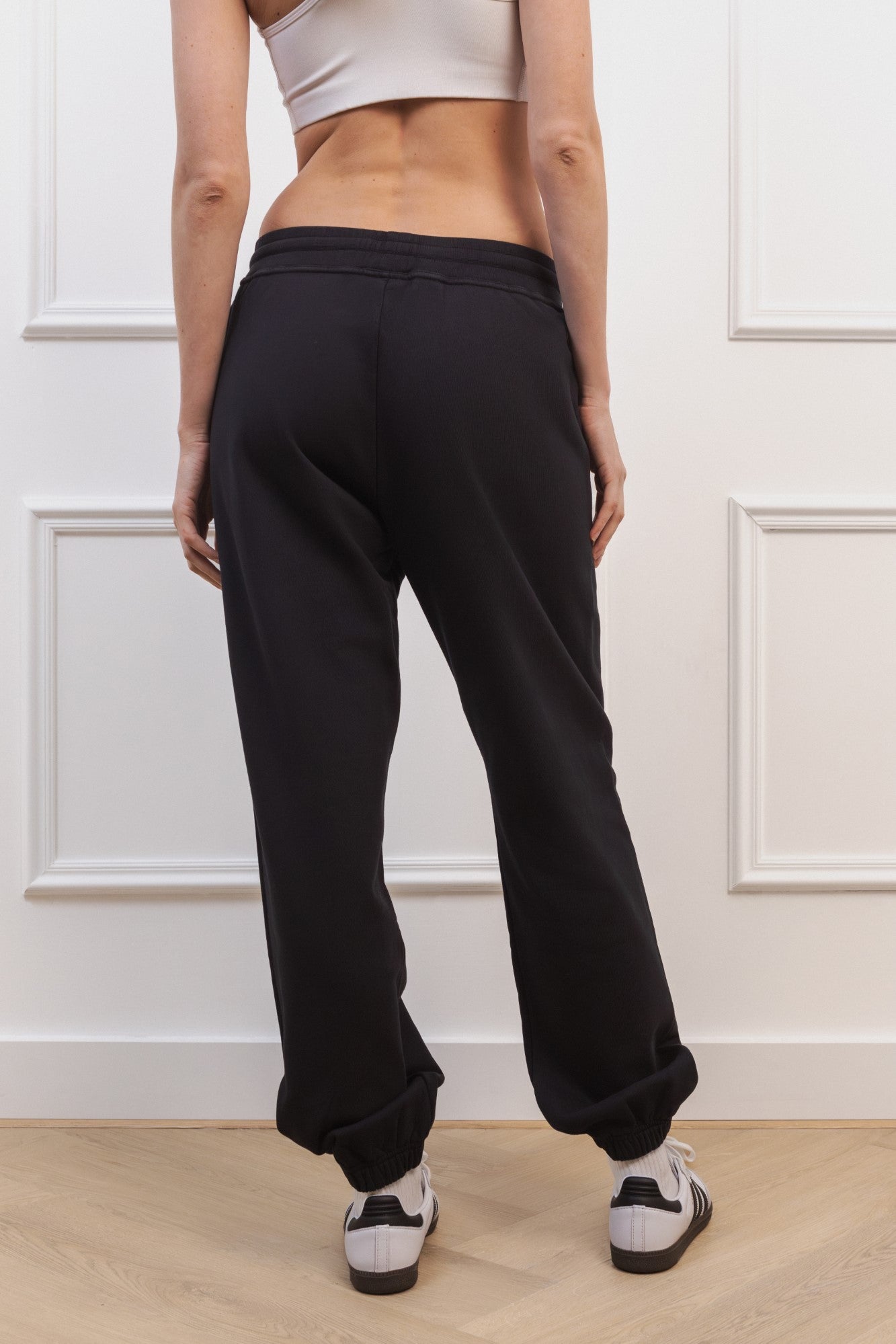 A sustainable sweatpant truly designed for comfort and confidence. The Silverlake Relaxed Sweatpant features a banded waist, adjustable drawstring, elastic ankle cuffs, and a comfortably relaxed yet slightly tapered fit that hits right above the ankle. Whether it's an overnight flight to Berlin or grabbing coffee with friends, our 415 gsm Organic Cotton sustainable sweatpants have a premium yet lightweight feel that makes them the perfect year-round sweatpant for any situation. Features our retro-inspired Veld Sport logo screenprinted on the upper leg.